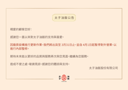 太子油飯 將進行廠房設備更新作業: